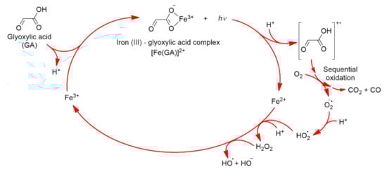 While the only study of the direct photochemistry of GA in water was described above [3], there are a few other relevant studies that arrive to related conclusions when investigating the effect of Fe3+ during irradiation. For example, Scheme 5 indicates that, upon 313 or 355 nm irradiation of complexes of iron (III) and GA in water, electron transfer proceeds from glyoxylate to the iron center [61,62], resulting in iron (II) and a radical cation [63], which based on our work contributes decarbonylation and decarboxylation reactions through formyl-oxyl radical (HOOC•) and formyl radical (•C(H)═O) intermediates [3]. The formyl radical can be further converted to formic acid by another iron (III) glyoxylate complex [61]. In the presence of dissolved O2, superoxide ion (O2−•), and its conjugated acid, the hydroperoxyl radical HO2•, (pKa = 4.8) is generated in the recycling of Fe2+ to Fe3+ [63]. These processes involving GA in the presence of iron (III) relevant to cloud water seem to favor the direct cleavage of the C-C bond. In addition, the formation of H2O2 depicted in Scheme 5 can also lead to further oxidation of organics by the Fenton generated HO• in the presence of Fe2+.