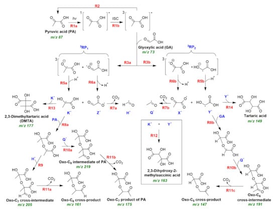 - Xia, S.-S.; Eugene, A.J.; Guzman, M.I. Cross Photoreaction of Glyoxylic and Pyruvic Acids in Model Aqueous Aerosol. J. Phys. Chem. A 2018, 122, 6457–6466. [Google Scholar] [CrossRef]