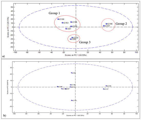 PCA scores plot obtained from the percentage of peak areas of the monoterpenes and sesquiterpenes of the volatile profile of fruits of Myrciaria floribunda: (a) groups formed with variability of 80.70% of areas; (b) groups formed with variability of 69.42% of the areas.
