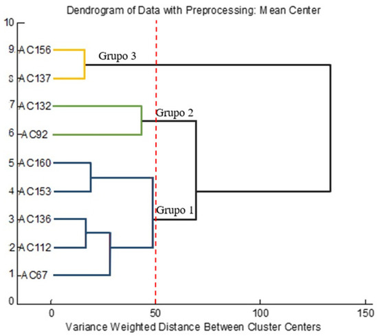 The groups formed in the PCA (Figure 2) were confirmed with the application of the Hierarchical Cluster Analysis (HCA), considering Euclidean distances, which generated the dendrogram shown in Figure 4. The dendrogram of the Hierarchical Cluster Analysis (HCA) is presented, which grouped the rumberry accesses into three main groups with a distance = 50.