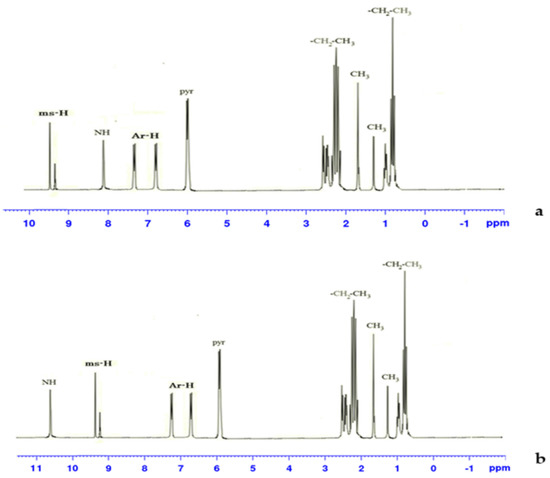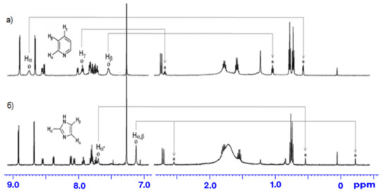 1H-NMR spectra of the 7-Py (a) and 7-Im (b) complexes in CDCl3 at 298 K. The o and * symbols denote the signals of the free and bound substrate molecules [47].