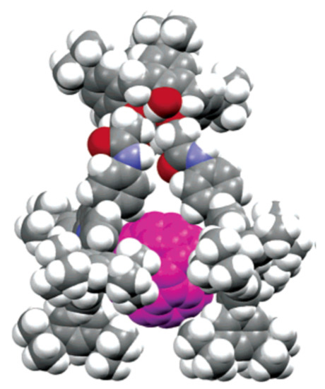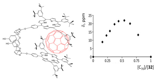 The ability of 17 to act as a receptor of the C60 and C70 fullerenes was studied by the authors using the 1H-NMR titration method. It was found that the C70 fullerene presence makes the signals of the porphyrin NH-protons shift up-field on the 1H-NMR spectrum. As the titration curve shows (Figure 3), the interaction leads to the formation of a 1:1 complex. It is shown (Table 4) that receptor 13 is highly selective to the C70 fullerene.