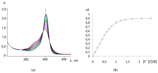 Changes in the absorption spectra (a) and the titration curve (b) of receptor 63 with a fluoride ion [28] = 4.5 × 10−6 M, [F−] = 0 ÷ 1,2 × 10−5 M in CD2Cl2, 298 K [67].
