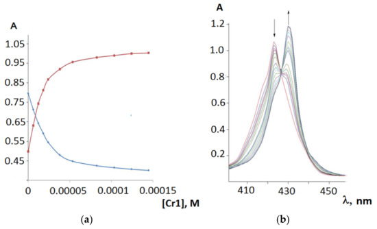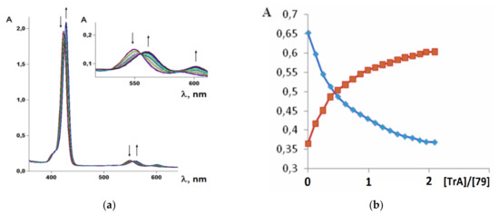 Thereaction of calix[4]pyrrole Bis-iododerivative (61) with zinc meso-ethynylporphyrinate (62) by the Sonogashira method was used to obtain calix[4]pyrrole-Bis-(porphyrin) conjugate (63) (Scheme 17). Applying spectrophotometric titration (Figure 8a), we established that formation of a complex of the calix[4]pyrrole fragment of receptor 61 with fluorine anions (Scheme 18) makes the Soret band in the absorption spectrum broader and less intensive, and in the region of the 1:1 molar ratio of the reagents, the reaction system becomes saturated (Figure 8b). It means that the interaction between receptor 63 and the anion produces 1:1 complexes (64) with the stability constant Ka = 15,000 M−1.