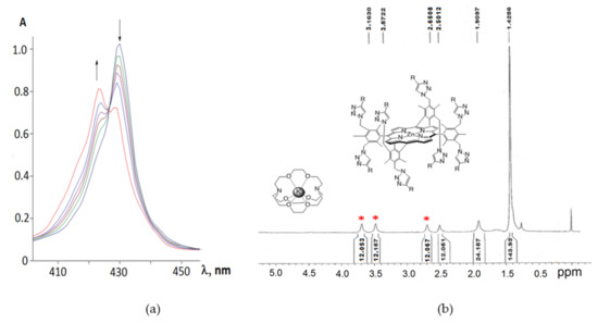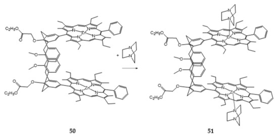 By applying the 1H-NMR method, we found that formation of complexes of calix[4]arene-Bis-(porphyrin) receptors 45, 49, and 50 with bidentate triethylenediamine (DABCO) represents the 1:2 type of interaction. Scheme 13 illustrates the interaction of receptor 50 with DABCO as an example. This hypothesis is also confirmed by the separation of the signals of the nonequivalent DABCO protons in the 1H-NMR spectrum of the complex (Figure 7a). It means that the mismatch between the geometry of the interporphyrin complexing cavity of the receptor and the substrate leads to one-center binding of the studied bidentate ligand and formation of an external complex (51) with the stability constant Ka = 4.7 105 M−2 [49].