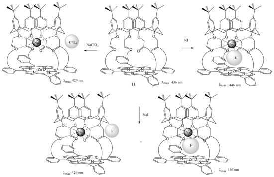 A zinc complex of compound (11) was obtained by treatment of ligand 8 with zinc acetate in DMF at room temperature. It was established that the modified porphyrin (3) shows very interesting ion-binding ability (Scheme 3). In NaClO4, Na+ is bound to the calix[4]arene cavity and ClO4− exists as a counter anion to give the 429 nm band, whereas in KI, K+ is bound to the calix[4]arene cavity and I− coordinates to Zn(II) to give 446 nm. These results indicate that the cavity with a hard-soft ditopic binding site is very suitable for recognition of I− ions.