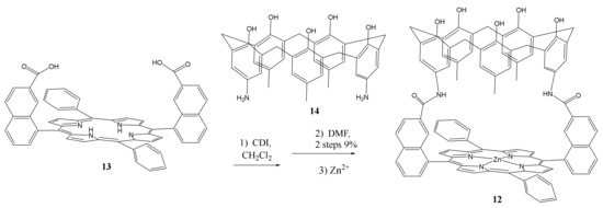 The synthesis and binding ability of a Zn-porphyrin (12) with a calix[5]arene cap were presented in [49]. In order to synthesize such a bridged porphyrin, 5,15-Bis-(carboxynaphtyl)-10,20-diphenylporphyrin (13) with syn arrangement of two naphthalene rings was prepared. Reaction of the porphyrin 13 with calix[5]arene with two amino functions (14) and subsequent treatment of the reaction product with zinc acetate gave the calix[5]arene-capped Zn-porphyrin 12 (Scheme 4).