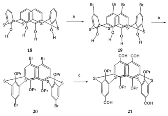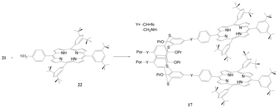 The procedure of synthesis of the tetra-formyl derivative of thiacalix[4]arene in the 1,3-alternate conformation is presented in Scheme 6. Bromation of commercially available tetrahydroxy-thiacalix[4]arene (18) by N-bromosuccinimide in acetone was used to synthesize tetrabromo-derivative (19), which was then turned into the respective propoxy-derivative (20) through its interaction with propyl iodide in the presence of potassium carbonate in acetone. It should be said that introduction of bulky propoxy-substituents into the upper ring of the initial thiacalix[4]arene makes the molecule change its cone conformation to the 1,3-alternate one. The interaction of (20) with tert-butyllithium in tetrahydrofuran accompanied by cooling allowed preparation of the target thiacalix[4]arene tetraaldehyde (21), which was then condensed with monoamino-porphyrin (22) in dichloromethane in the presence of molecular sieves, to synthesize thiacalix[4]arene-Bis-(porphyrin) (17) (Scheme 7).