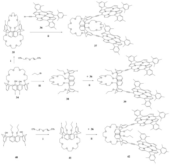 The same authors developed a versatile stepwise synthetic approach allowing selection of the calix[4]arene conformation, the type of functionalization of the calixarene rims, and the anchoring point of the chromophores on the calix[4]arene spacer [39]. Connection of the ethynyl-derivative 36 with the calix[4]arene derivatives 34, 35, and 38 in the presence of 10% Pd(PPh3)2Cl2, CuI, and Net3 in toluene gave three calix[4]arene Bis-porphyrin conjugates 37, 39, and 42 (Scheme 9).