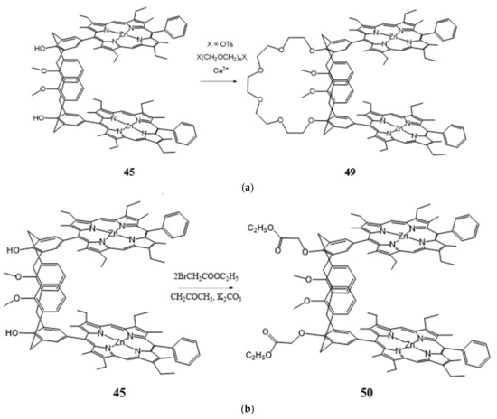 (a) Synthesis of the Bis-porphyrin-calix[4]arene-crawn-[6] (49); (b) Synthesis of the ethoxycarbonyl-substituted Bis-porphyrin-calix[4]arene (50).