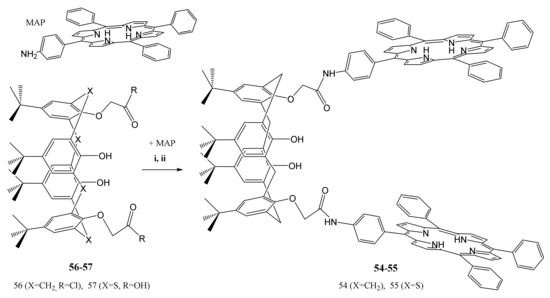 Several different approaches for the synthesis of Bis-porphyrin-calixarenes have been developed [37,42]. First, Bis-porphyrin-calixarenes (54–55), in which porphyrin moieties are linked to the calix[4]arene fragment through amide bridges, were synthesized by two methods: (i) by reaction of calix[4]arenes acyl chloride (56) with monoaminotetraphenylporphyrinininin the presence of base (Et3N); (ii) by a direct reaction of carboxylic acid (57) with monoaminotetraphenylporphyrin using dicyclohexylcarbodiimide as a coupling agent (Scheme 15) [42].