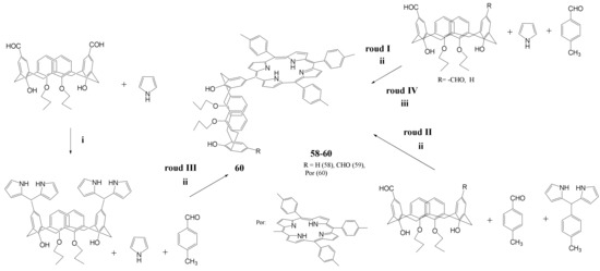 Later, Káset al. obtainedBis-porphyrin-calixarenescontaining directly linked porphyrin and calixarene fragments via condensation of an excess of pyrrole and p-methoxylbenzaldehyd with calix[4]arene-5,17-dialdehyde under BF3·Et2O catalysis in chloroform [37]. Subsequent oxidation of the intermediate porphyrinogen gave the corresponding Bis-porphyrin-calixarene conjugate (60) according to Scheme 16.