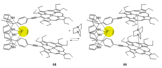 The down-field shift of the NH-protons of the calix[4]pyrrole fragment indicates that the complex formation causes the spacer to change its 1,3-alternate conformation to a cone (Figure 9). It is shown that complex formation involving a calix[4]pyrrole fragment can be used to control complex formation through the interporphyrin complexing cavity of receptor 63. Without the anion, the reaction of 63 with DABCO results in the formation of an external 1:2 complex (65) (Scheme 19) with the stability constant Ka = 4.7 × 105 M−2. The formation of external 1:2 complex 30 is confirmed by the splitting of the substrate proton signals in the 1H-NMR spectrum of the respective complex.