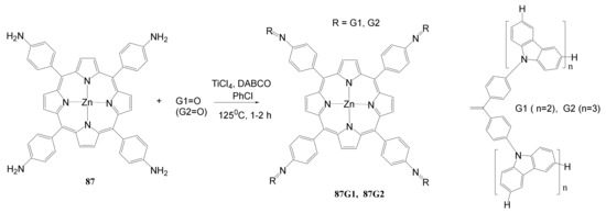 - Nguyen, N.T.; Mamardashvili, G.M.; Kulikova, O.M.; Scheblykin, I.G.; Mamardashvili, N.Z.; Dehaen, W. Binding ability of first and second generation/ carbazolylphenyl dendrimers with Zn(II) tetraphenylporphyrin core towards small heterocyclic substrates. RSC Adv. 2014, 4, 19703–19709. [Google Scholar] [CrossRef]
