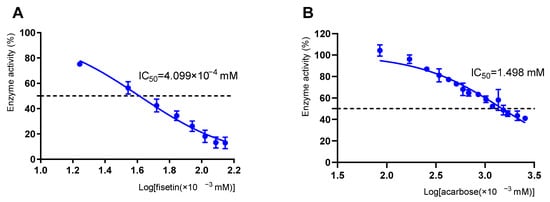 Figure 2. α-glucosidase inhibitor assay. (A) Inhibitory activity of fisetin against α-glucosidase. (B) Inhibitory activity of acarbose against α-glucosidase.