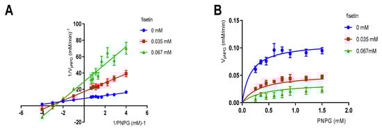 Figure 3. Enzymatic kinetic assay. (A) Lineweaver-Burke plot of the inhibition kinetics of α-glucosidase by fisetin. (B) Michaelis-Menten plot for fisetin in the presence of p-nitrophenyl-β-glucopyranoside (pNPG) at several concentrations for the determination of Ki.