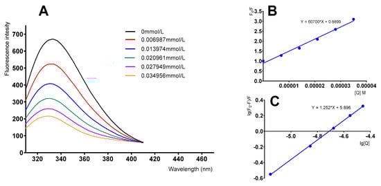 To investigate the interaction between fisetin and α-glucosidase, fluorescence quenching experiments were performed. The fluorescence spectra shown in Figure 4A were obtained by varying the concentration of fisetin while keeping the α-glucosidase concentration unchanged. We found that with the increase in flavonoid concentration, the fluorescence intensity of fisetin was gradually quenched and the absorption peaks showed hypsochromic shifts.