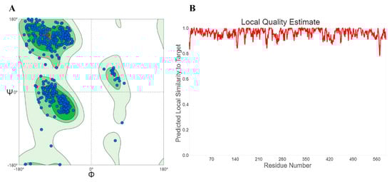 Figure 5. Homology modeling of α-glucosidase. (A) Ramachandran plot of the selected model protein. (B) The local quality estimate of the selected model protein.