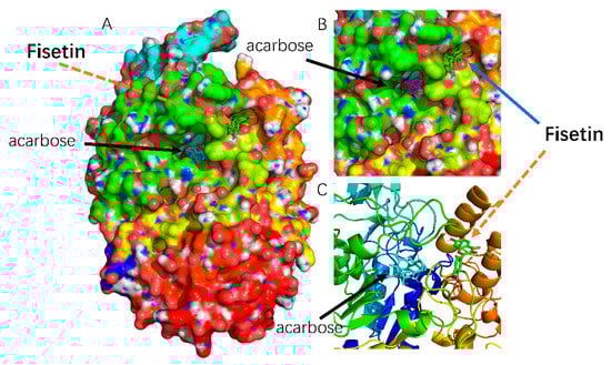 Figure 6. (A) Predicted binding sites of fisetin and acarbose docked with α-glucosidase. (B) The zoomed-in view of the binding locus on molecular surface. (C) The zoomed-in view of the binding sites docked with α-glucosidase drawn by cartoon image.