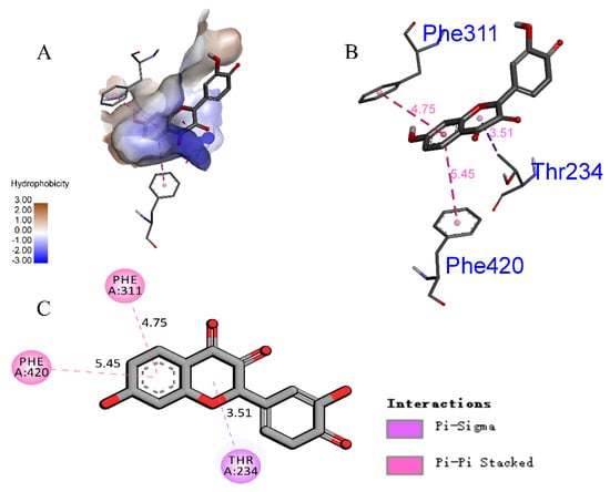 The amino acids in the 4 Å surrounding fisetin were analyzed in detail. As shown in Figure 7 and Figure 8A, fisetin is bound in a large hydrophobic pocket of α-glucosidase, surrounded by amino acid residues including ILE-415, PHE-420, ILE-416, PHE-232, PHE-311, PHE-430, PHE-310, ILE-315, and VAL-316. Furthermore, the fisetin phenyl ring showed a Pi-Sigma interaction at 3.51 Å with THR234 (Figure 8C). Moreover, a Pi-Pi stacked interaction formed between the phenyl ring of fisetin and PHE311, PHE420 of α-glucosidase, which played an essential role during the binding process [20].