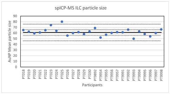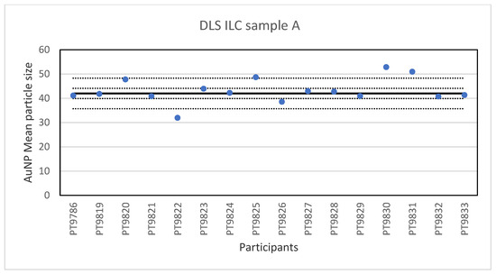 Results for the particle size reported by participants in the PTA ILC. The straight line indicates the consensus value, the dotted lines one and three times the robust standard deviation.