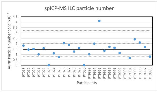 Results for the particle number concentration reported by participants in the spICP-MS ILC. The straight line indicates the consensus value, the dotted lines one and three times the robust standard deviation.