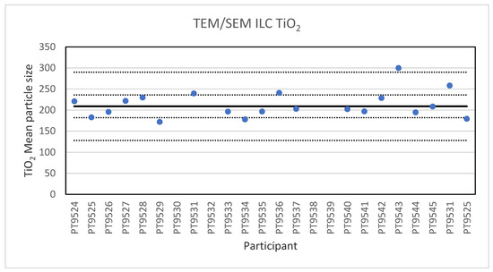 Results for the particle size of the TiO2 particle reported by the participants in the TEM/SEM ILC. The straight line indicates the consensus value, the dotted lines one and three times the robust standard deviation.