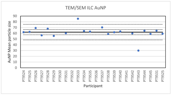 Results for the particle size of the AuNP particle reported by the participants in the TEM/SEM ILC. The straight line indicates the consensus value, the dotted lines one and three times the robust standard deviation.
