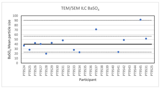 Results for the particle size of the BaSO4 particle NPs reported by the participants in the TEM/SEM ILC. The straight line indicates the consensus value, the dotted lines one and three times the robust standard deviation.