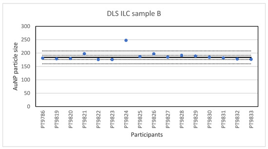 Results for the particle size in sample B reported by participants in the DLS ILC. The straight line indicates the consensus value, the dotted lines one and three times the robust standard deviation.