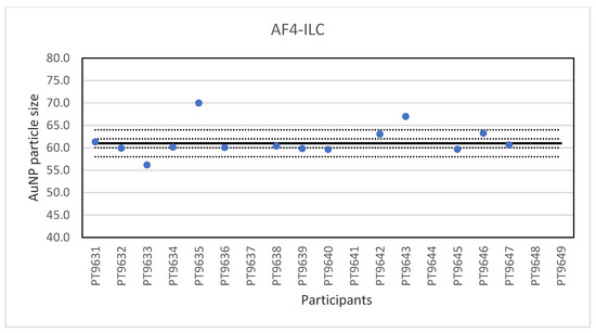 Results for the particle size reported by participants in the AF4 ILC. The straight line indicates the consensus value, the dotted lines one and three times the robust standard deviation.