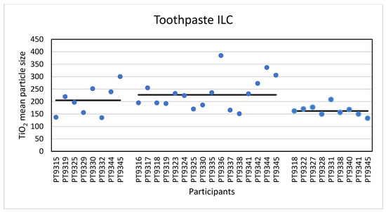 In the last ILC, two consumer products, a sunscreen lotion and a toothpaste were sent to the participants. The participants were informed that both materials contained TiO2 particles of unknown size and were requested to determine the particle size of the TiO2 particles using one or more of the PTA, spICP-MS, or TEM/SEM techniques. A sample preparation procedure was given for both matrices and was as follows: Toothpaste: Weigh out a subsample of 200 mg and mix with 20 mL of ultrapure water. Mix on a magnetic stirrer for 1 hr and subsequently sonicate in an ultrasonic bath for 15 min. Sunscreen lotion: Weight out a subsample of 200 mg and mix with 20 mL of ethanol. Vortex for 1 min and sonicate in an ultrasonic bath for 15 min. These suspensions may be used as such for the analysis using TEM/SEM. For analysis with PTA a further dilution of 500 times in ultrapure water was advised. For spICP-MS a further dilution of 10,000 times (toothpaste) and 100,000 times (sunscreen lotion) in ultrapure water was advised. In house methods should be used for the instrumental analyses using PTA, spICP-MS and TEM/SEM and references to CEN/TS 17273 and ISO/ TS 19590:2017 were included. The participants were requested to report the mean particle size and the D50 value (the median particle size where 50% of the particles is smaller than that size and 50% larger, a D50 value < 100 nm indicates a NM), both expressed in nm.