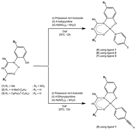 - Novoa, N.; Roisnel, T.; Dorcet, V.; Cador, O.; Manzur, C.; Carrillo, D.; Hamon, J.-R. Efficient preparation of multimetallic ONO-based Schiff base complexes of nickel(II) and copper(II). New J. Chem. 2016, 40, 5920–5929. [Google Scholar] [CrossRef]