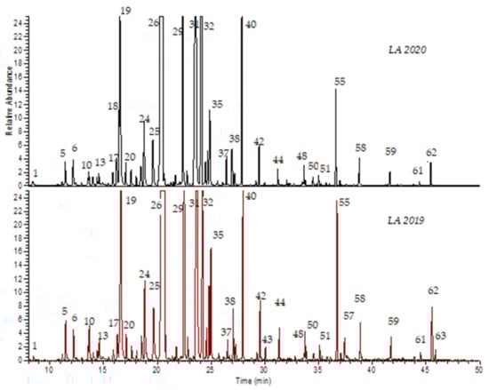 The GC-MS TIC chromatograms of the LA 2019 and LA 2020 samples. Numbers refer to those reported in Table 1.