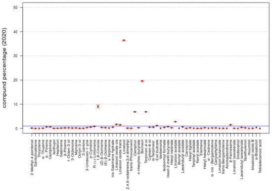 where n is the number of compounds considered in both samples, while and are the two sets of percentages, LA 2019 and LA 2020, respectively. The use of PMA statistics is popular in ecology to detect the level of affinity between two samples in terms of species compositions [32]. In this setting, the PMA index was used to compare the LA 2019 composition with the LA 2020 one. The value obtained was PMA = 93.61%, confirming a high level of global similarity between the two samples.