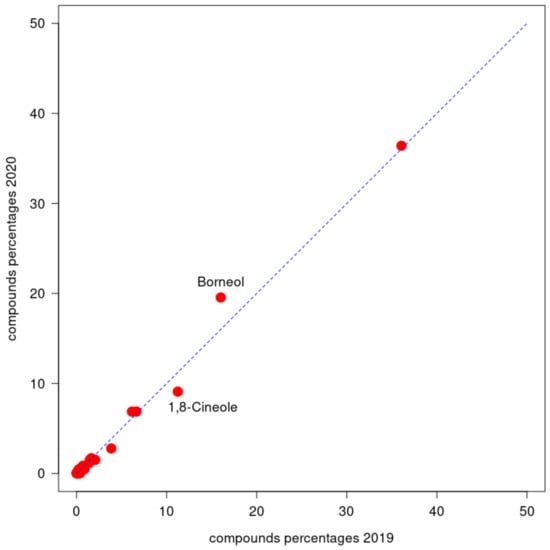 To compare the compounds of the two samples, the following Figure 4 presents a cross-plot of the two sets of percentages with the 2019 data on the x-axis and the 2020 data on the y-axis. The dashed line represents the situation in which a certain compound was present in the same percentages in both samples. The points distant from the line represent compounds observed in rather different percentages with respect to the two samples. In particular, 1,8-Cineole had a level of 11.0% in LA 2019 and 9.0% in LA 2020, and Borneol had levels of 15.7% and 19.4%, respectively.