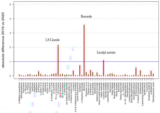 In Figure 5, the bar plot of the absolute differences that contributed to the calculation of the PMA index are reported. The three compounds that showed an absolute difference greater than the threshold of 1% (line in blue) are highlighted by the name: 1,8-Cineole (11.0% vs. 9.0%), Borneol (15.7% vs. 19.4%) and Linalyl (or Linalool) acetate (3.8% vs. 2.8%). Even though these compounds characterized both the compositions of LA 2019 and LA 2020 (as stated previously), the differences between the two samples represented potential and specific features that can distinguish the two types of lavender. However, this aspect needs further investigation.