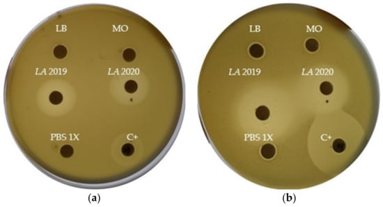 Zones of growth inhibition (halos) of E. coli DH5α (a) and B. subtilis PY79 (b) in the presence of 10 μL of LA 2019 and LA 2020 EOs. We used 10 μL of LB broth (LB), 10 μL of mineral oil (MO) and 10 μL of PBS 1X as negative controls, and amoxicillin (20 μg) + clavulanic acid (10 μg) as positive control (C+).