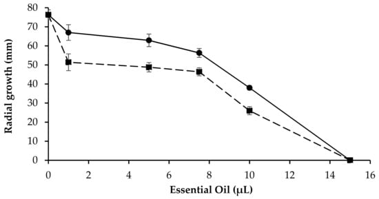 Toxic effect with different concentrations of the LA 2019 (●) and LA 2020 (▪) pure EOs of L. augustifolia on the radial growth of S. rolfsii. Tests were conducted in triplicate ± SE.
