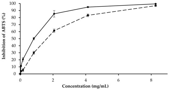 Scavenging effect of the two different essential oils of L. augustifolia, LA 2019 (●) and LA 2020 (▪) on ABTS assays at different concentrations ranging from 0.041 mg/mL to 8.5 mg/mL. Data are expressed as mean values ± SE (n = 3).