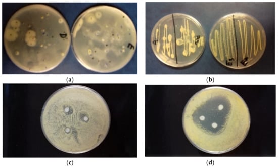 (a) Microbial growth on agarized cultural medium from paint surface sampled using the sterile velvet technique. (b) Isolation of viable and yellow pigmented bacterial strains, Micrococcus luteus. (c) Antibacterial in vitro test carried out with LA 2019 EO and the absence of antimicrobial effects (halo < 6 mm). (d) Antibacterial in vitro test carried out with LA 2020 EO and the presence of antimicrobial effects (halo > 6 mm).