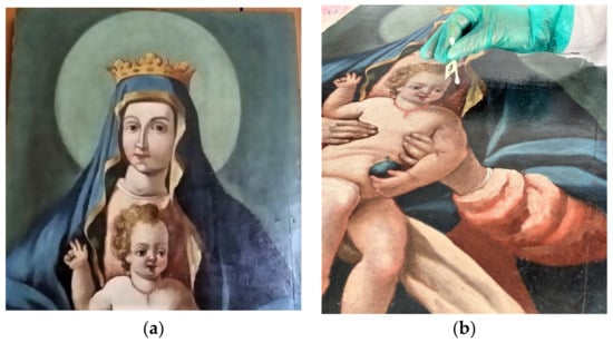 A historical wood painting was chosen for the ex situ study “Madonna con Bambino”, originally located on the inner wall of the S. Maria del Lago church at Pesche (Isernia, Italy), Figure 11a. The artwork (140 cm × 55 cm × 3.5 cm) painted by an anonymous painter was submitted to microbiological sampling on the basis of aesthetical alterations on the surface of the paint after preliminary observation by R. Sartorio Restorer (Uraniarst, Isernia, Italy), commissioned by the Bishop in charge at the Cathedral-Bishop’s Curia, Isernia. The water painting was irregularly affected by very small lacunas, visible even to the naked eye, only in some areas on the paint’s surface.