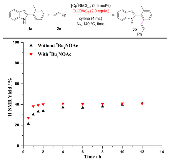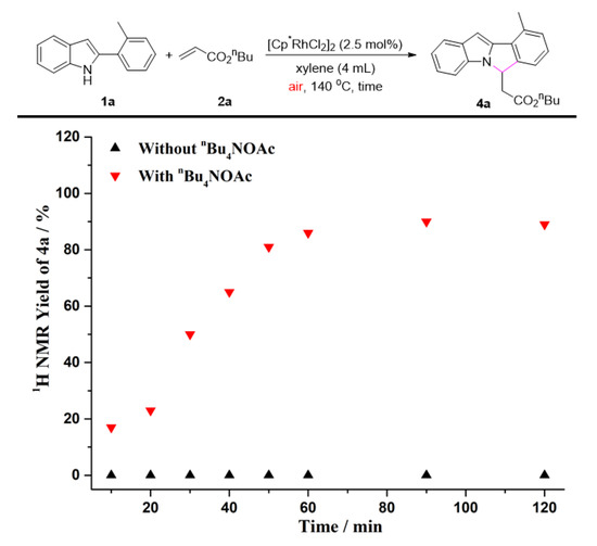 To gain further insights into the impact of quaternary ammonium salts in the present transformation, we conducted several kinetic studies via 1H NMR spectroscopy. The time study shown in Figure 1 revealed that the one-pot C-H olefination/aza-Michael reaction under air atmosphere afforded 50% yield of 4a after 30 min and was completed within 2 h by adding n-Bu4NOAc. It must be pointed out that the C-H olefinated product was not detected during monitoring period. Without n-Bu4NOAc, 4a was not obtained at all, and nor was the C-H olefinated product (3a) formed. Quaternary ammonium salts have always been considered to be an effective catalyst for Michael reactions [74,75,76,77,78,79]. As one can see from Figure 2, the intramolecular aza-Michael reaction of ortho-alkenylated-2-phenyl-1H-indole could indeed be improved by the addition of n-Bu4NOAc. 1 equiv. of n-Bu4NOAc, and provided complete conversion and quantitative yield of 4a after just 3 min. In the absence of n-Bu4NOAc, no reaction occurred, and the ortho-alkenylated-2-phenyl-1H-indole was totally recovered. The further kinetic experiments were carried out using Cu(OAc)2 instead of O2 as the terminal oxidant. As seen in Figure 3, the C-H olefination of 2-phenylindole with with n-butyl acrylate completed within 2 h in the absence of n-Bu4NOAc, affording 90% yield of 3a. By adding n-Bu4NOAc, the C-H olefinated product (3a) was totally transformed into aza-Michael product 4a within 2 h (Figure 4). In order to illustrate the impact of n-Bu4NOAc in the C-H olefination step, styrene was chosen as the coupling partner because it is not a Michael acceptor, and the reaction can stop after C-H olefination. As shown in Figure 5, no significant differences were observed between experiments performed with or without n-Bu4NOAc. These observations suggest that quaternary ammonium salt plays at least two roles in the oxidative annuation of 2-phenyl-1H-indole with with alkenes: (a) It promotes the intramolecular aza-Michael reaction of the C-H olefinated product; and (b) It promotes aerobic reoxidation of Rh(I) to Rh(III). The second role was partly validated by the fact that the current catalytic system ([Cp*RhCl2]2/n-Bu4NOAc/O2) was also effective for the oxidative annulation of 2-phenylindoles with alkynes to assemble indolo[2,1-a]isoquinoline skeletons. One reason why quaternary ammonium salt can speed up aerobic reoxidation is probably due to the increased dissolved quantity of O2 from adding quaternary ammonium salt [80,81,82].