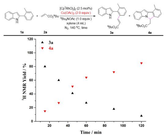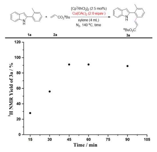 Reaction condition: Figure 1. A solution of 1a (0.2 mmol), 2a (0.4 mmol), [Cp*RhCl2]2 (2.5 mol%), and n-Bu4NOAc (1.0 equiv.) in xylenes (4 mL) at 140 °C under air. Figure 2. A solution of 3a (0.2 mmol) and n-Bu4NOAc (1.0 equiv.) in xylenes (4 mL) at 140 °C under air. Figure 3. A solution of 1a (0.2 mmol), 2a (0.4 mmol), [Cp*RhCl2]2 (2.5 mol%), and Cu(OAc)2 (2.0 equiv.) in xylenes (4 mL) at 140 °C under N2. Figure 4. A solution of 1a (0.2 mmol), 2a (0.4 mmol), [Cp*RhCl2]2 (2.5 mol%), n-Bu4NOAc (1.0 equiv.), and Cu(OAc)2 (2.0 equiv.) in xylenes (4 mL) at 140 °C under N2. Figure 5. A solution of 1a (0.2 mmol), 2e (0.4 mmol), [Cp*RhCl2]2 (2.5 mol%), n-Bu4NOAc (1.0 equiv.), and Cu(OAc)2 (2.0 equiv.) in xylenes (4 mL) at 140 °C under N2. The yields were determined by the 1H NMR yield using CH2Br2 (0.3 M, 0.2 mmol, 14 mg) as an internal standard.