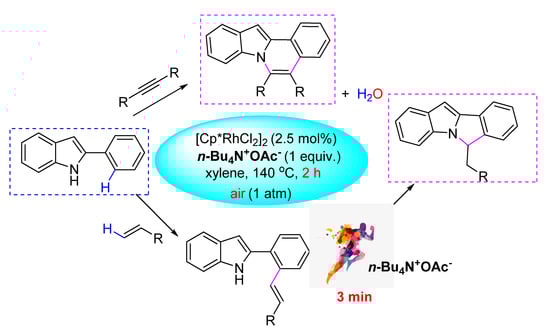 C-H functionalization, including the reaction of a C-H bond with a (pseudo)halide, the reaction of a C-H bond with an organometallic reagent, and cross-coupling between two C-H bonds (CDC reaction), has gained tremendous popularity in recent years as a methodology for the construction of C-C bonds or C-heteroatom bonds [1,2,3,4,5,6,7,8,9,10,11,12]. Among these reactions, the CDC reaction is especially noteworthy because this reaction precludes both coupling partners from pre-functionalization, and as a result has high step economy and atom economy [13,14,15,16,17,18,19,20,21]. In 2007, Miura and Satoh reported on [RhCp*Cl2]2-catalyzed oxidative coupling of benzoic acids with alkynes [22]. Since then, rhodium-catalyzed oxidative C-H coupling has drawn increasing attention, and many important organic building blocks have been produced [23,24,25,26,27,28,29,30]. However, despite indisputable advances, all rhodium-catalyzed C-H oxidative coupling reactions are extremely limited to hazardous and stoichiometric oxidants such as AgOAc [31,32,33,34,35,36,37] and Cu(OAc)2 [38,39,40,41,42,43,44,45,46,47]. The use of molecular oxygen is advantageous over other oxidants because only water is generated as a by-product [48,49,50,51,52,53,54]. So far, in sharp contrast to aerobic palladium-catalyzed CDC reactions [55,56,57,58,59,60,61,62,63,64,65], only very limited examples of rhodium-catalyzed CDC reaction utilizing molecular oxygen as the sole oxidant have been reported to date [66,67,68,69,70]. Therefore, the development of protocols using molecular oxygen as the oxidant is highly desirable. In continuation of our research on transition metal-catalyzed aerobic CDC reactions [71,72,73], herein we report on the rhodium-catalyzed oxidative annulation of 2-arylindoles or 7-arylindoles with alkenes or alkynes using molecular oxygen as the sole oxidant enabled by quaternary ammonium salt (Scheme 1).