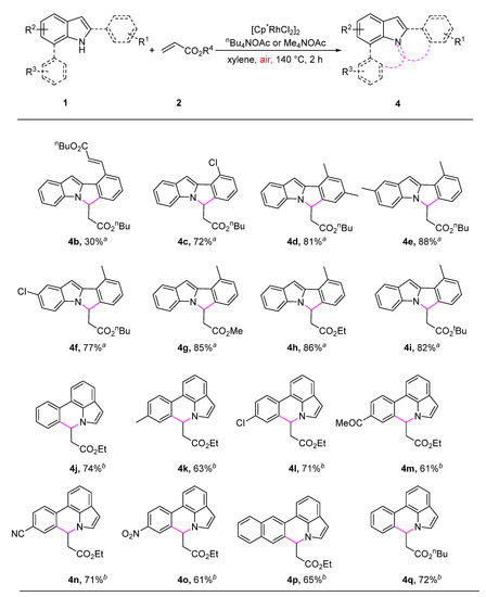 With the optimized conditions in hand, the generality of the rhodium-catalyzed aerobic C-H olefination/aza-Michael reaction was then explored (Scheme 2). The reaction of 2-phenyl-1H-indole, which contains two ortho-C-H bonds with n-butyl acrylate, provided the desired annulated product 4b in low yield (30%) with recovered starting material (65%). Therefore, blocking one of the ortho-C-H bonds with methyl or chloro is essential for full conversion. 2-phenyl-1H-indole derivatives with substituents at the benzene ring or indole ring were delivered the corresponding products in good to excellent yields, showing very limited effect on the reaction efficiency (4c–4f). As expected, other acrylates bearing methyl, ethyl, or tert-butyl all well reacted with 1a to afford the desired product 4g–4i in good yields. The C-H olefination/aza-Michael reaction of 7-phenyl-1H-indoles with ethyl acrylate afforded the corresponding pyrrolo[3,2,1-de]phenanthridine derivatives under the reaction conditions by changing n-Bu4NOAc with Me4NOAc. By contrast, only one ortho-C-H bond was cleaved, showing good chemoselectivity (4j–4q). 7-phenylindoles and acrylates bearing various substituents, such as chloro (4l), ketone (4m), CN (4n), NO2 (4o), naphthyl (4p), and n-butyl (4q) coupled well with ethyl acrylate or ethyl acrylate, showing good functional group tolerance. The experiment results also showed no electronic effect on the reaction efficiency.