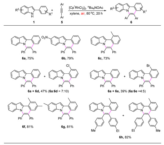 Substrate scope of oxidative annulation of 2-phenyl-1H-indoles with alkynes a. a: Reaction condition: 1a (0.2 mmol), 5 (0.4 mmol), [Cp*RhCl2]2 (2.5 mol%), and n-Bu4NOAc (1 equiv.) in xylenes (4 mL) at 80 °C under air atmosphere for 20 h. Isolated yield.