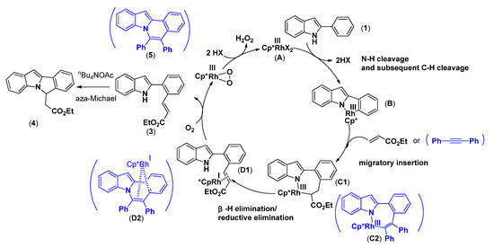Based on the experimental results obtained above and precedent reports [31,32,34,44], a plausible mechanism for the aerobic rhodium-catalyzed oxidative annulation of 2-phenylindole with alkene or alkyne is postulated in Scheme 4. Coordination of N atom of phenylindole to Rh(III) and the subsequent ortho-C-H activation produced the five-membered rhodacycle B. B inserted into the alkene or alkyne affording the intermediate C1 or C2, and the subsequent β-H elimination/reductive elimination provided Rh(I) sandwich complex D1 or D2. Then D1 or D2 was oxidized by oxygen to regenerate the active Rh(III) species and released the corresponding product 3 or 5. The C-H olefinated product (3) can be transformed into aza-Michael product 4 efficiently, and the oxidation step by molecular oxygen will be sped up substantially by adding quaternary ammonium salts.