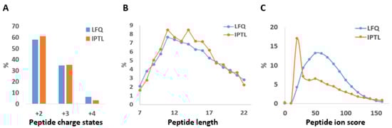 Characteristics of quantified peptides using LFQ and IPTL. (A) The peptide counts with charges of 2+ to 4+ is shown, (B) the peptide length are compared, and (C) the distribution of the peptide ion scores from Mascot is displayed.