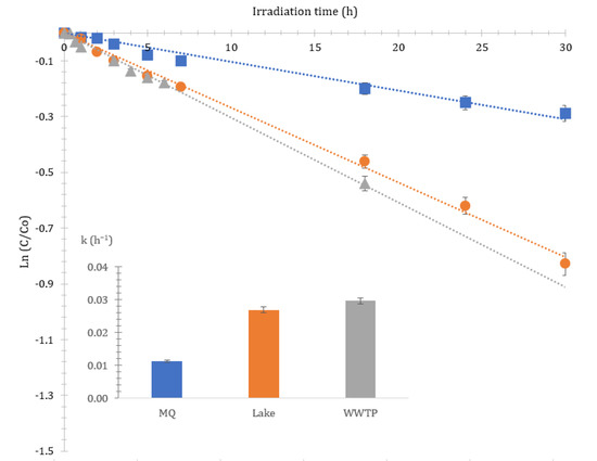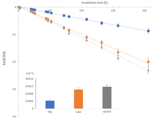 At the same conditions, no degradation was observed in dark controls in either MQ water or lake/WWTP samples, indicating that the compound under investigation was hardly susceptible to hydrolysis. Photolysis rates followed the same order as the natural sunlight experiments: WWTP > lake > MQ water, thus indicating that constituents of natural waters affect CIT’s decomposition [26]. According to the Table S1 and Table S2, the natural organic matter (NOM) concentration is higher in WWTP, followed by the lake, thus showing that, as the NOM concentration increases in natural waters, the rate of photolysis increases.